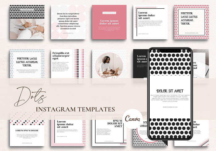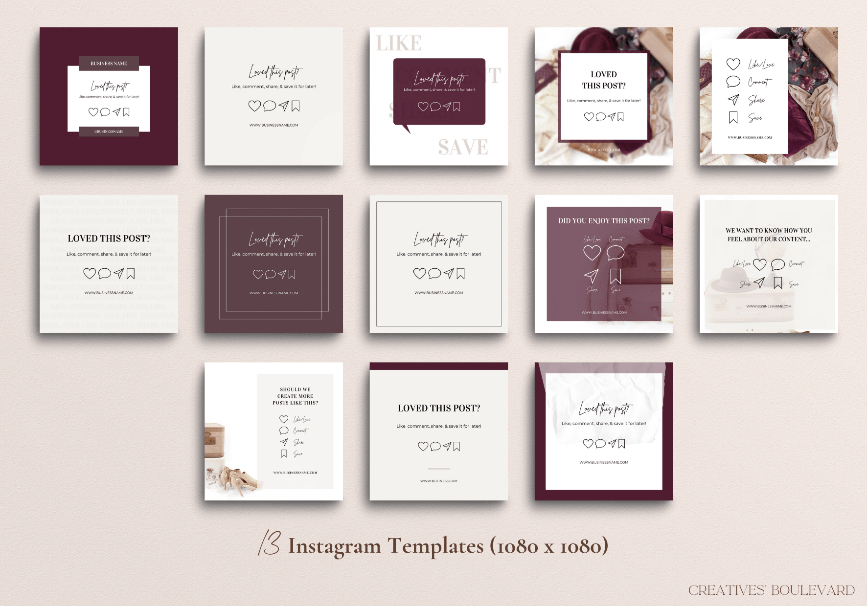 This particular template includes 13 Instagram Templates (1080 x 1080). You may use these templates on whichever platform you choose that allows these particular dimensions.