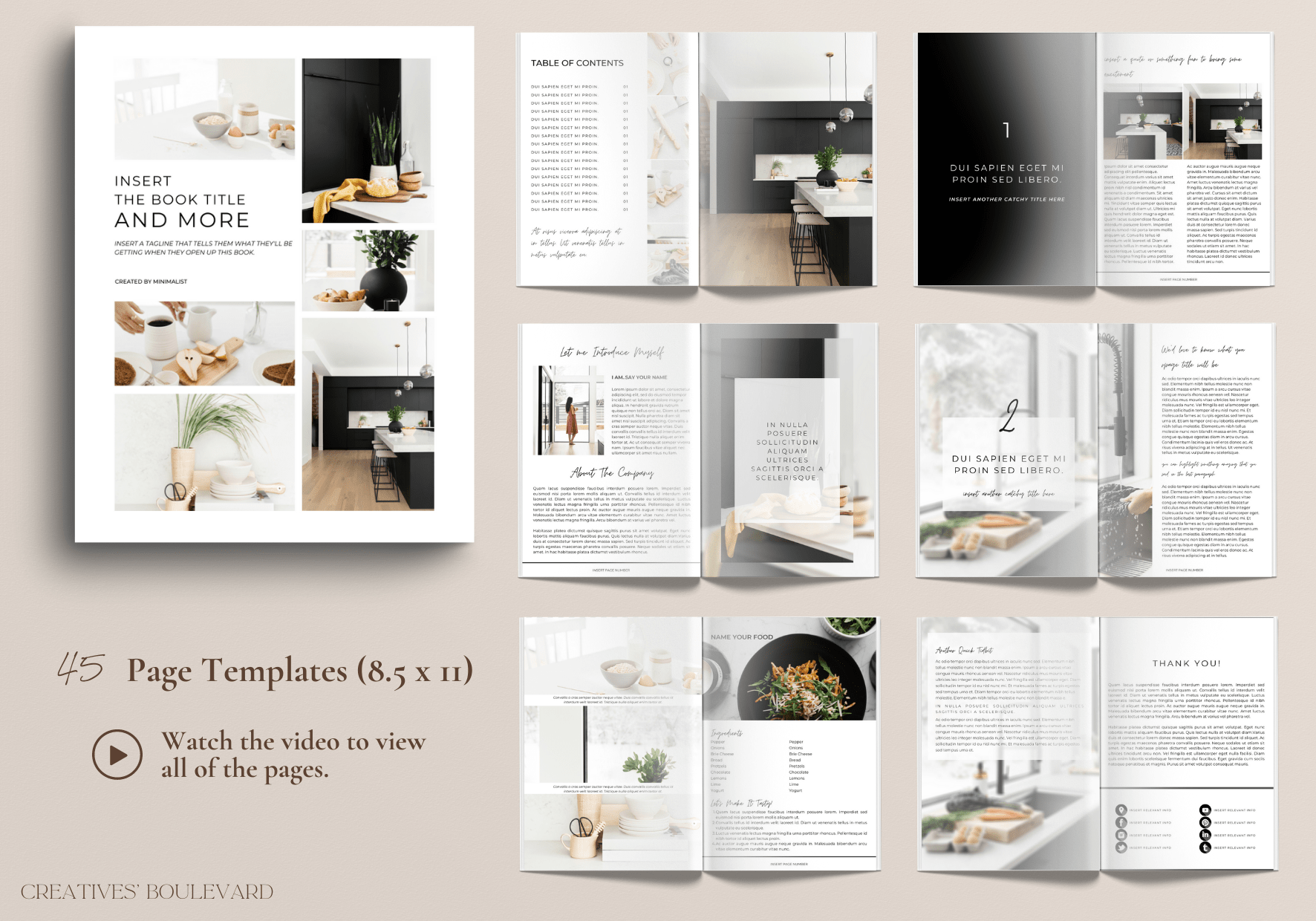 (4) Cover Page Variations | (4) Table Of Content Variations | (3) About/Introduction Page Variations | (3) Thank You Pages | (5) Quote Pages | (3) Chapter Pages | (3) Recipe Variations | (10) Content Pages | (4) Testimonial Pages | (5) Photo Pages